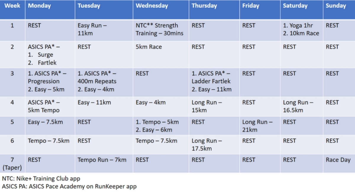I searched online for 6 weeks marathon training plans but couldn’t find a good plan that suits my capability, most of them require me to log a weekly long run of at least 21km, which wasn’t something I can do easily without building up my mileage.